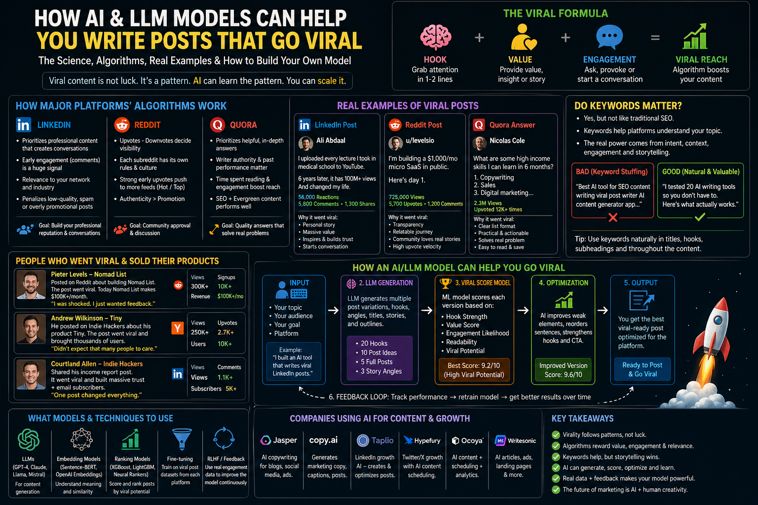 This story proves two things at once. First, virality can absolutely sell a product, even a tiny side project. Second, the underlying method was not “I hacked the algorithm.” It was: study what already spreads, extract the pattern, package it into a tool or story that people want to share, and place it in the right communities. It is also an example of what not to copy operationally on LinkedIn, because LinkedIn explicitly forbids third-party crawlers, bots, browser extensions, and automated scraping without permission. [32]